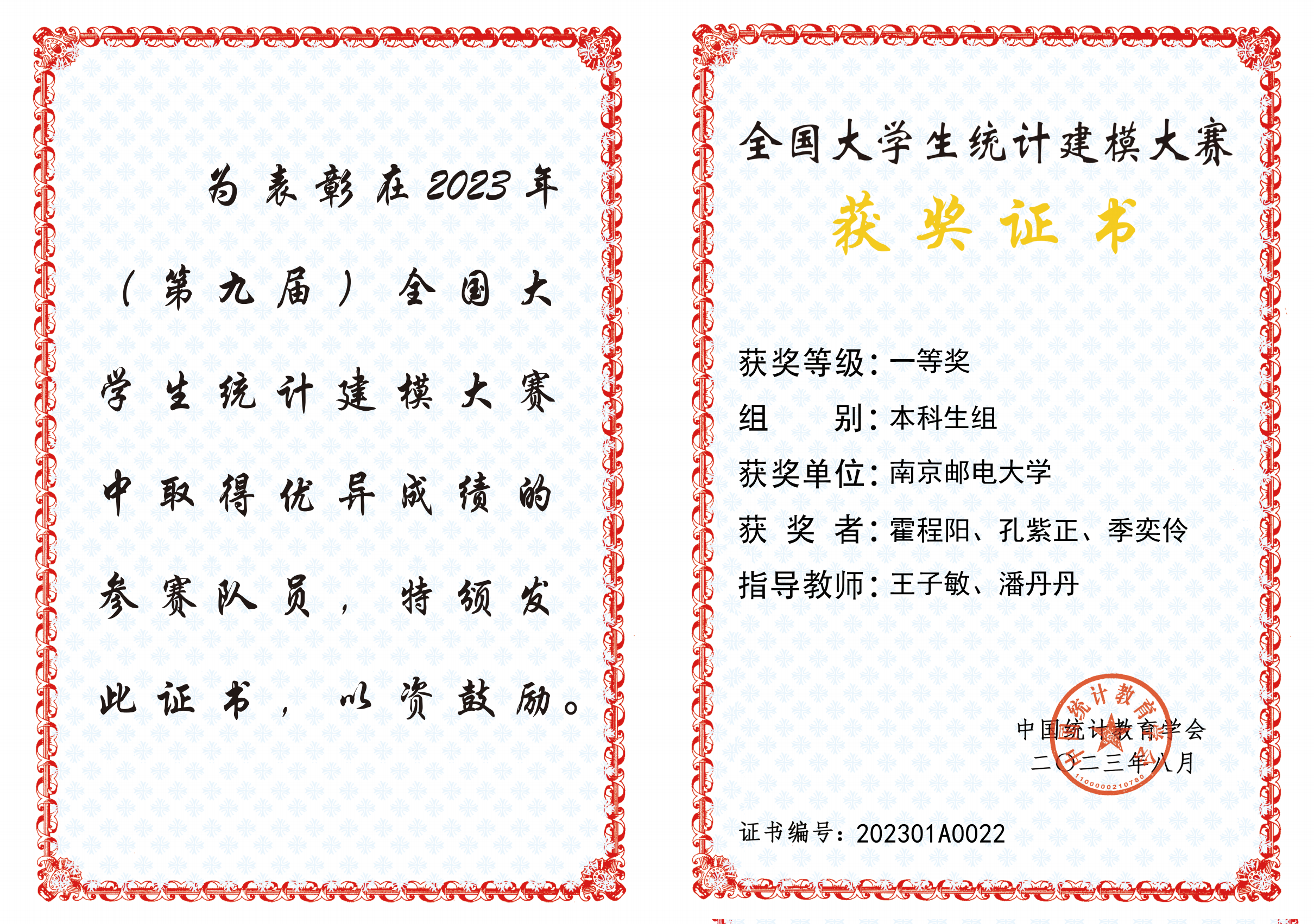 我院學(xué)生在第九屆全國(guó)大學(xué)生統(tǒng)計(jì)建模大賽本科生組中獲得“一等獎(jiǎng)”